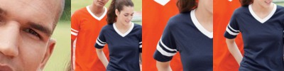 The polyester/cotton/rayon construction of this stylish v-neck tee delivers cool comfort.