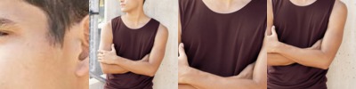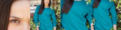 • Raw-edge seams on raglan shoulders, side gusset panels, pocket and waistband