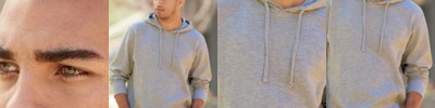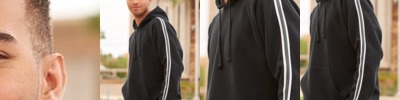 - Three-piece jersey lined, contrast-color hood with sewn eyelets and contrast-color drawcord