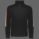 Heavyweight 100% polyester matte brushed tricot * Tag-free label * Quarter zip pullover style * Contrast color inserts * Set-in sleeves * Front pouch pockets * Self-fabric cuffs and bottom band
