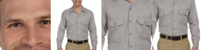 65% polyester, 35% cotton; Visa® moisture-wicking and stain-release finish; Generous fit across shoulders; Long-sleeves, extra-long tail and 20-line melamine buttons; Two chest pockets and two-button cuffs for a custom fit; Dickies logo patch at bottom of placket; Shirt colors match Dickies traditional work pants;