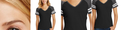 preshrunk 100% ring-spun cotton • 4.5-oz. • 30 singles • missy contoured silhouette with side seams • 1/2" rib-knit v-neck collar • shoulder-to-shoulder taping • double-needle sleeve and bottom hems • tear-away label • Sizes: S-2XL